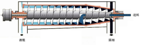 主機(jī)啟動達(dá)到加料轉(zhuǎn)速,進(jìn)料閥打開懸浮液連續(xù)進(jìn)入機(jī)內(nèi),經(jīng)螺旋輸送器的內(nèi)筒出料口進(jìn)入轉(zhuǎn)鼓內(nèi),在離心力的作用下,懸浮液在轉(zhuǎn)鼓內(nèi)形成一環(huán)形液流,固體顆粒在離心力的作用下沉降到轉(zhuǎn)鼓內(nèi)壁上,由于差速器的差動作用使螺旋輸送器與轉(zhuǎn)鼓之間形成相對運動,沉渣被螺旋推送到轉(zhuǎn)鼓小端的干燥區(qū)進(jìn)一步脫水,然后經(jīng)出渣口排出。液相形成一個內(nèi)環(huán),不斷的經(jīng)轉(zhuǎn)鼓大端溢流孔排出。如液相是含有輕、重兩相的乳濁液,由于比重不同,形成輕、重兩液環(huán),從轉(zhuǎn)鼓大端排出機(jī)外。